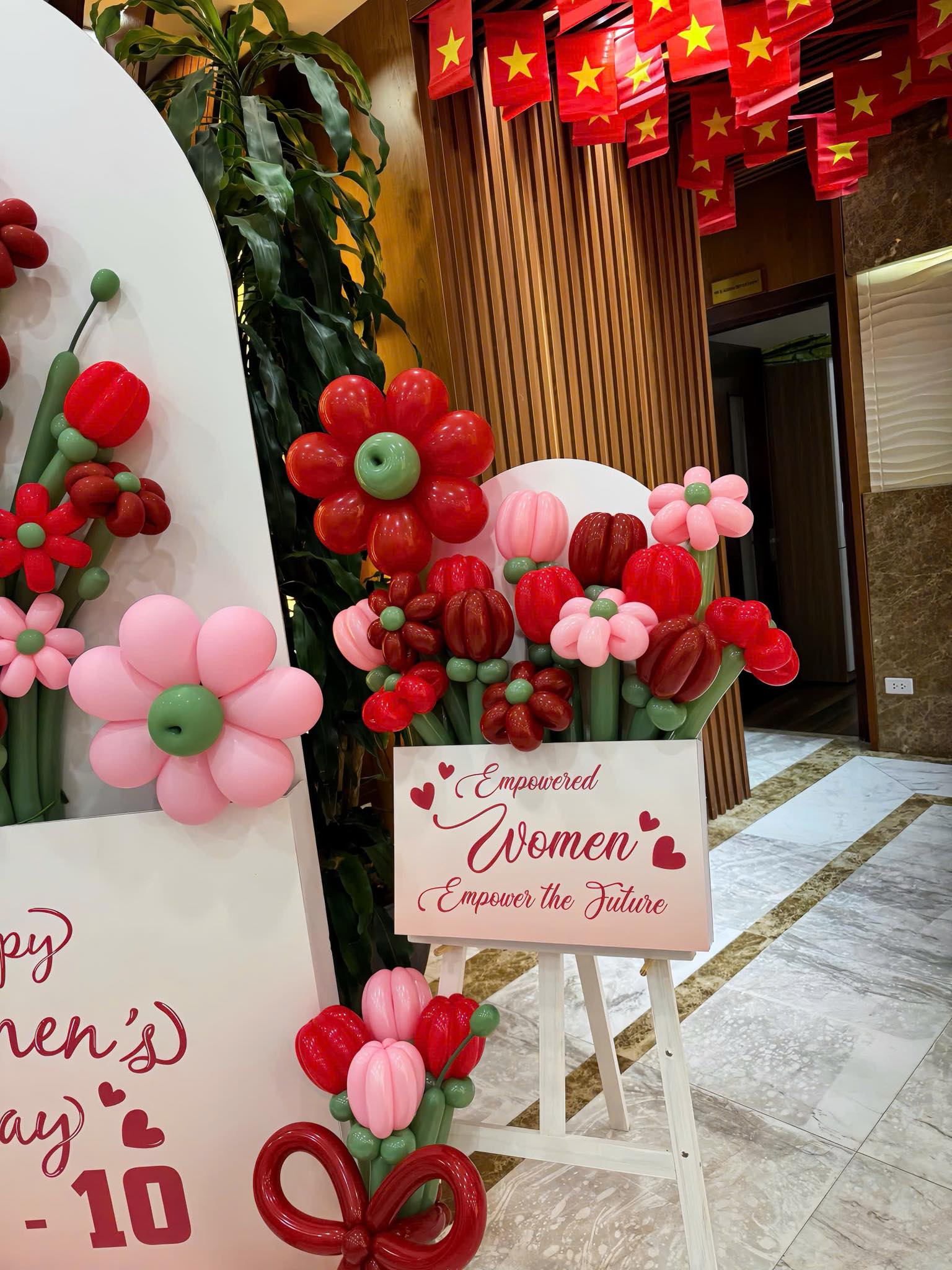 Từ ý tưởng những đóa hoa đang độ nở rộ, booth được tạo hình bằng bóng nghệ thuật, phối cùng tông đỏ, hồng, trắng tượng trưng cho sức sống mạnh mẽ, tình yêu và sự dịu dàng của người phụ nữ Việt.