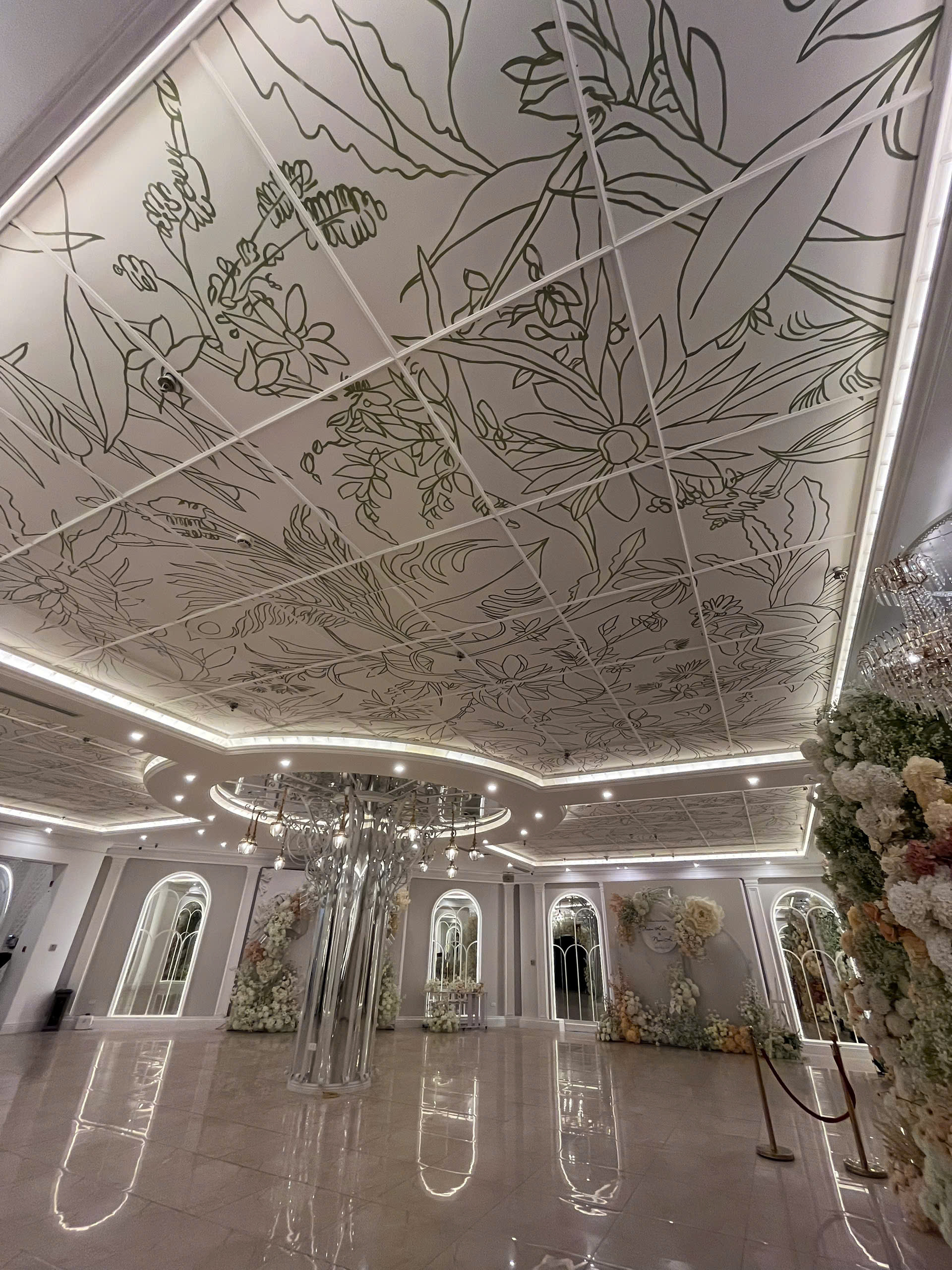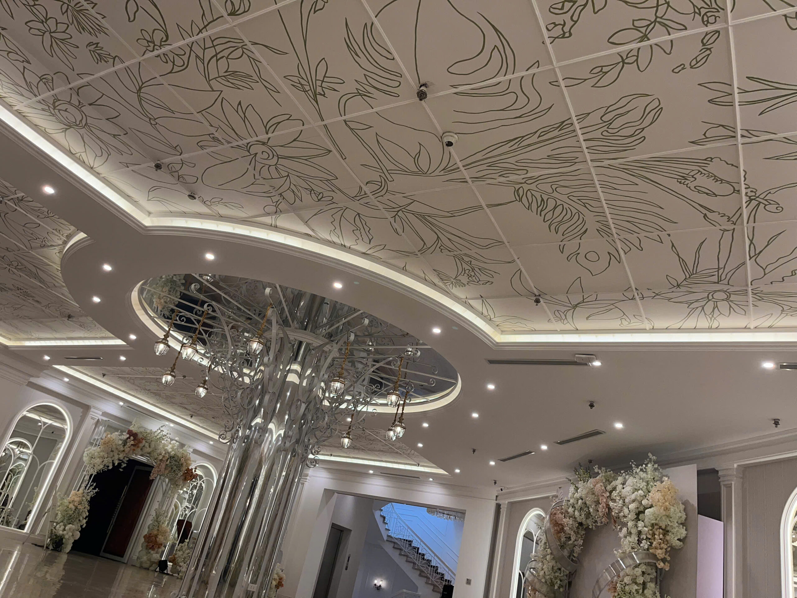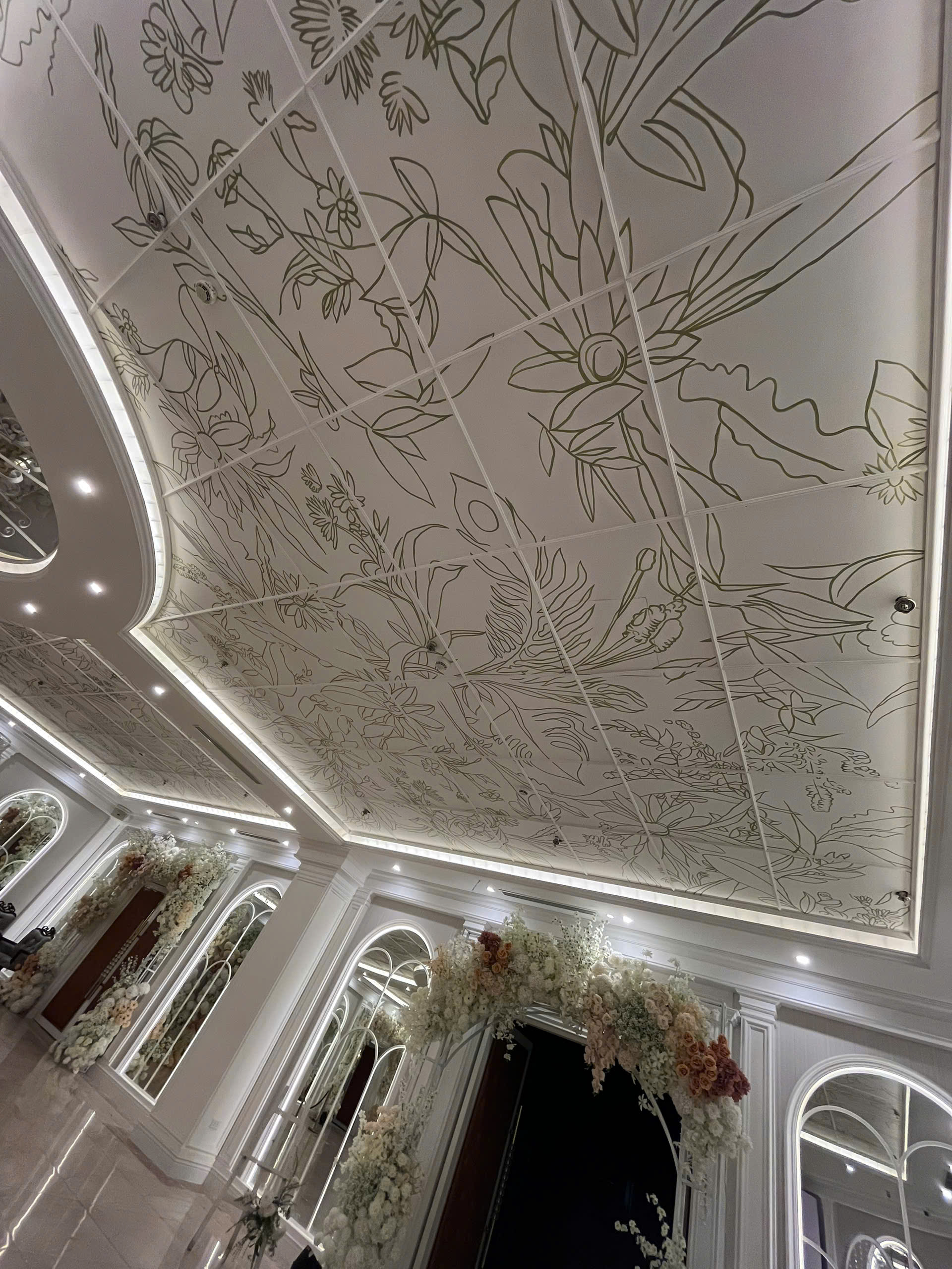 Nhìn từ xa, trần nhà tại Trống Đồng Place như một bức họa khổng lồ vẽ bằng đường nét thanh mảnh, gợi hình hoa lá, cỏ cây, tựa như khu vườn thiên nhiên đang nở rộ ngay giữa không gian sang trọng.