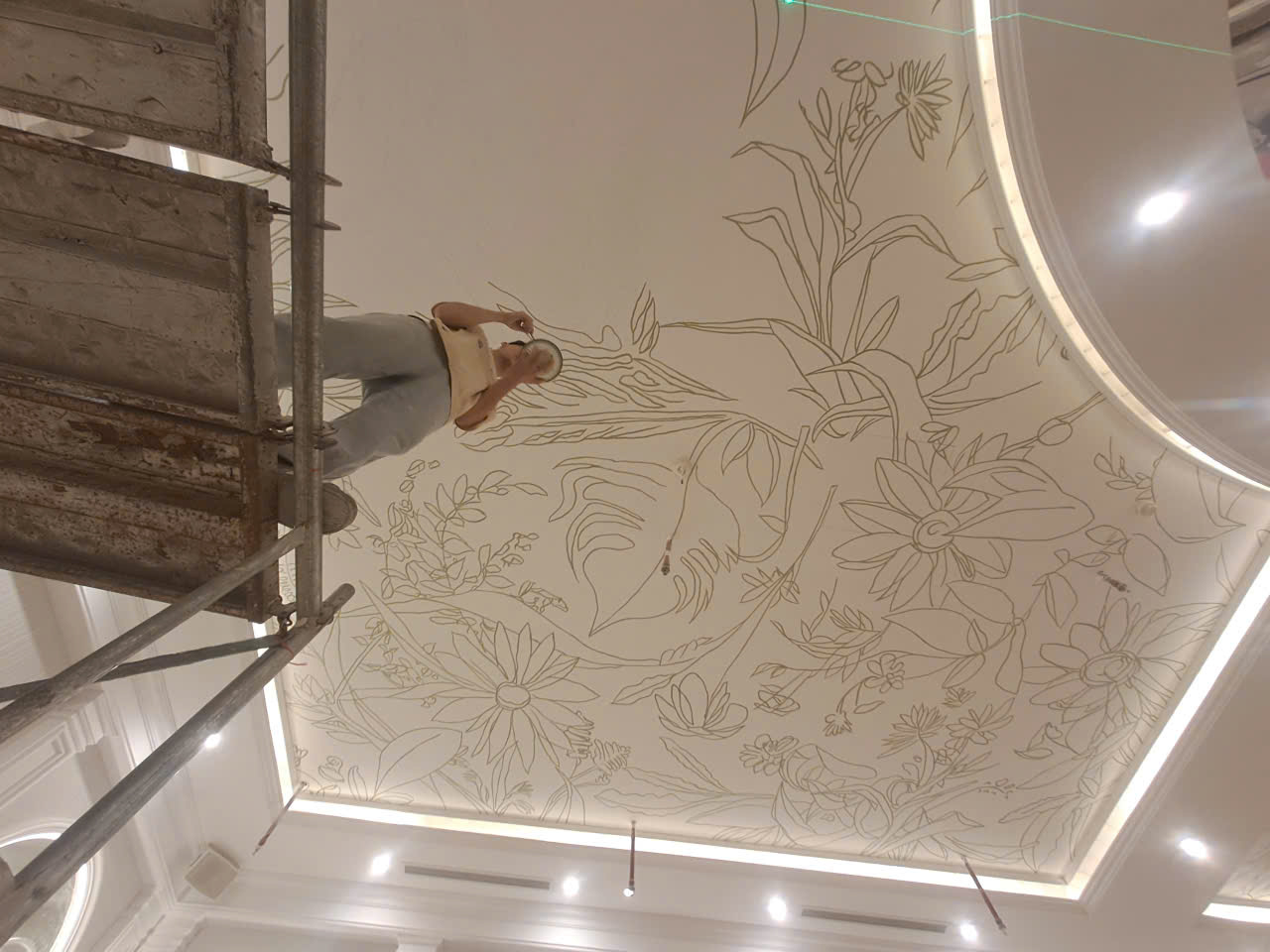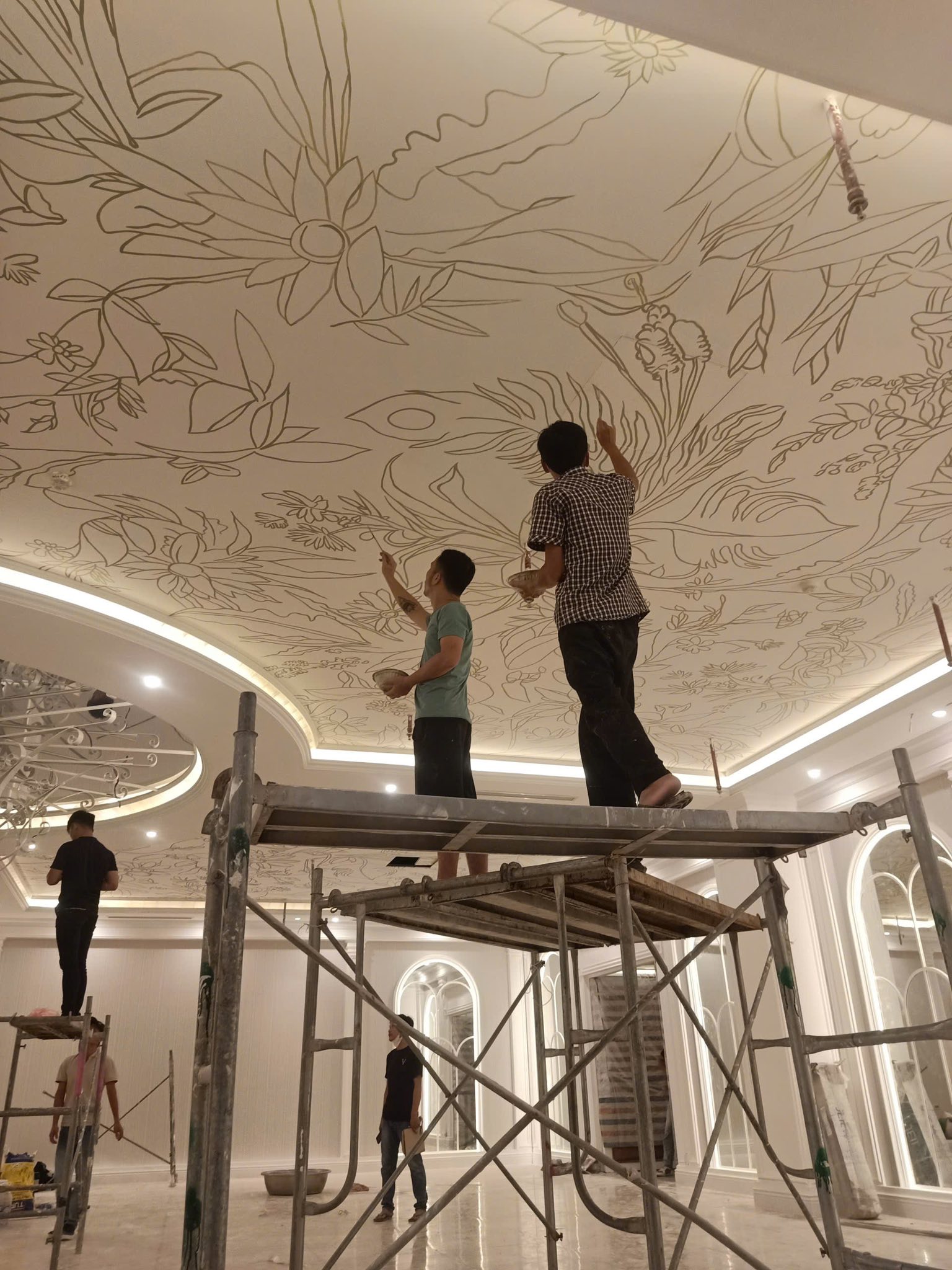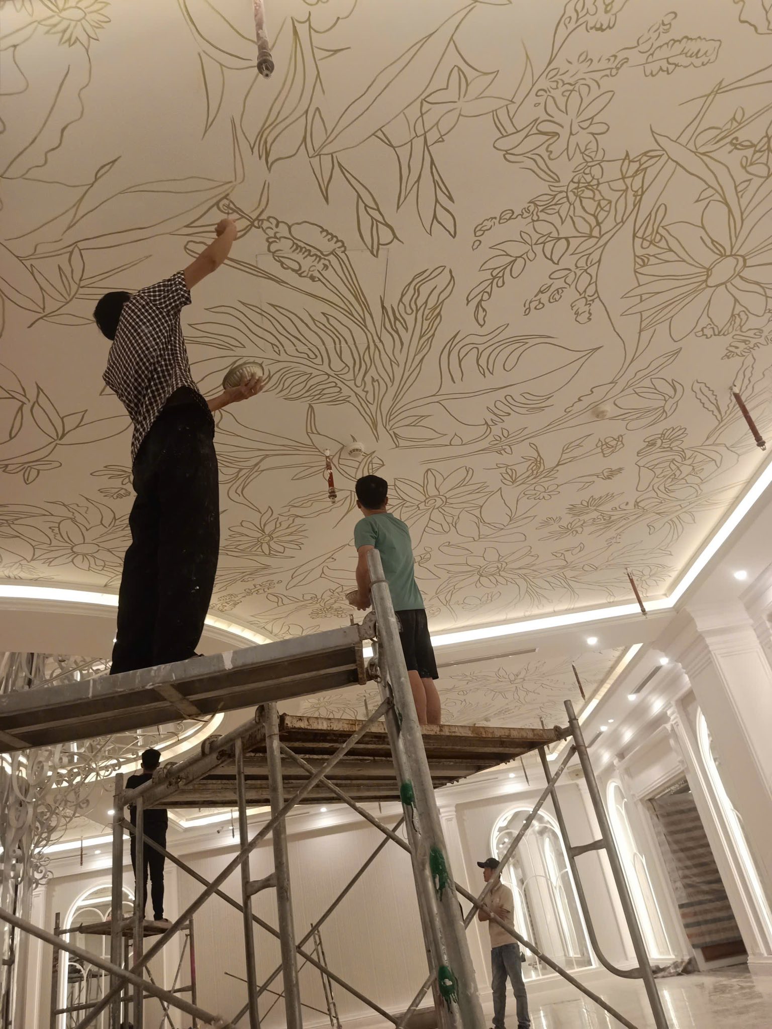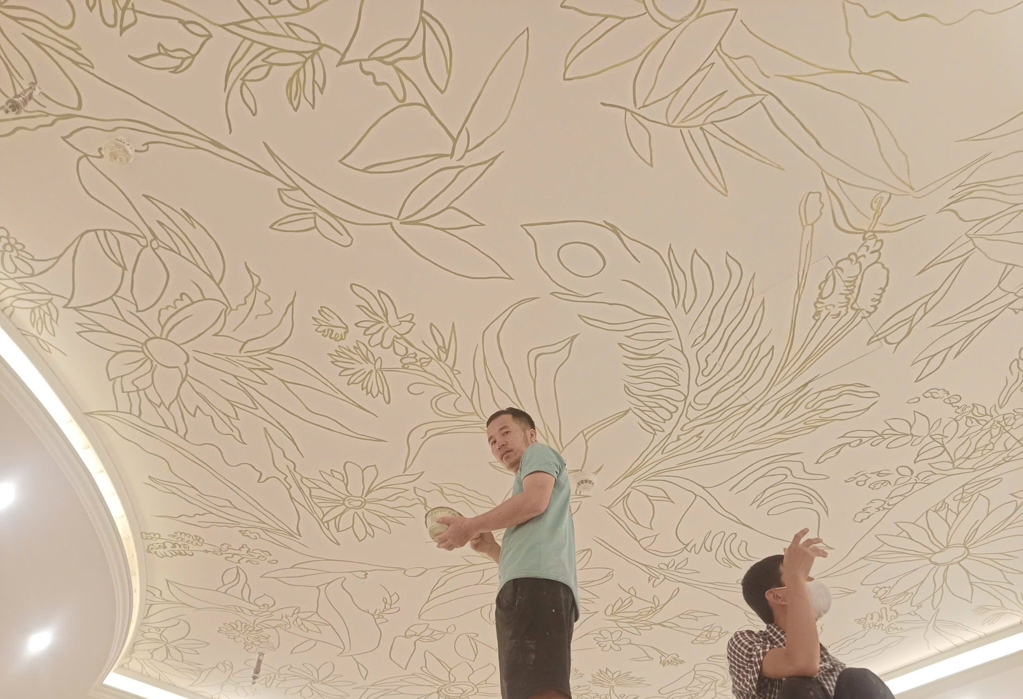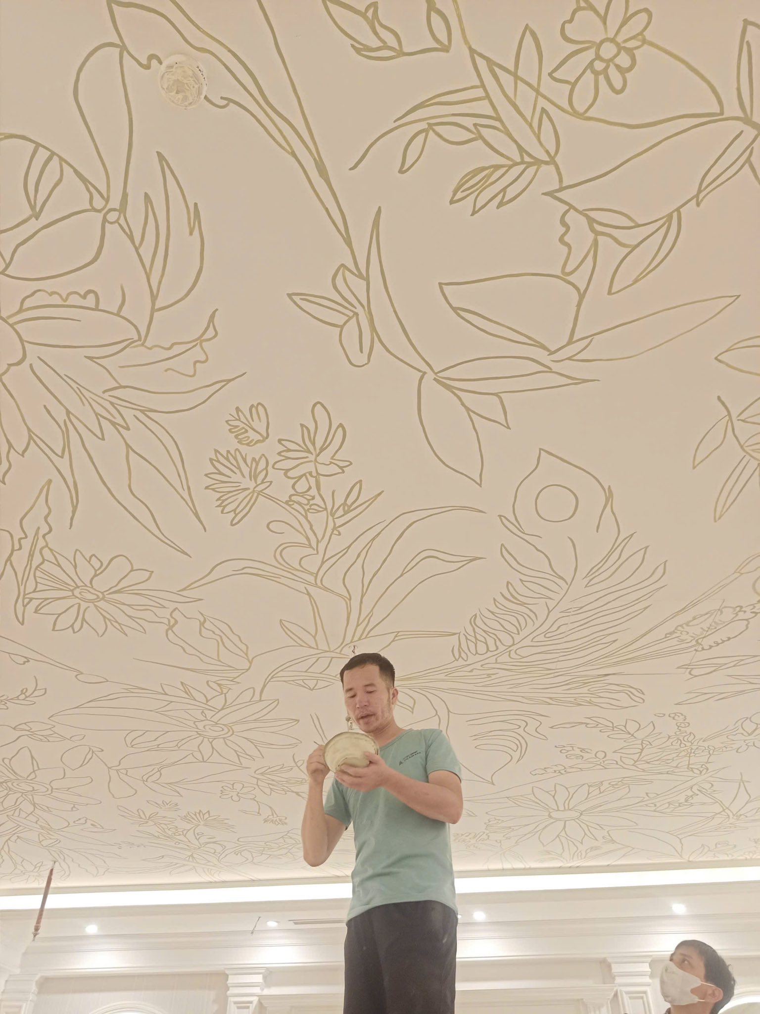 Một trong những dự án tiêu biểu vừa hoàn thành là tranh trần nghệ thuật tại Trống Đồng Place (72 Trần Đăng Ninh), công trình được thiết kế tinh tế, mang hơi thở tự nhiên và nhịp điệu của sự sống.