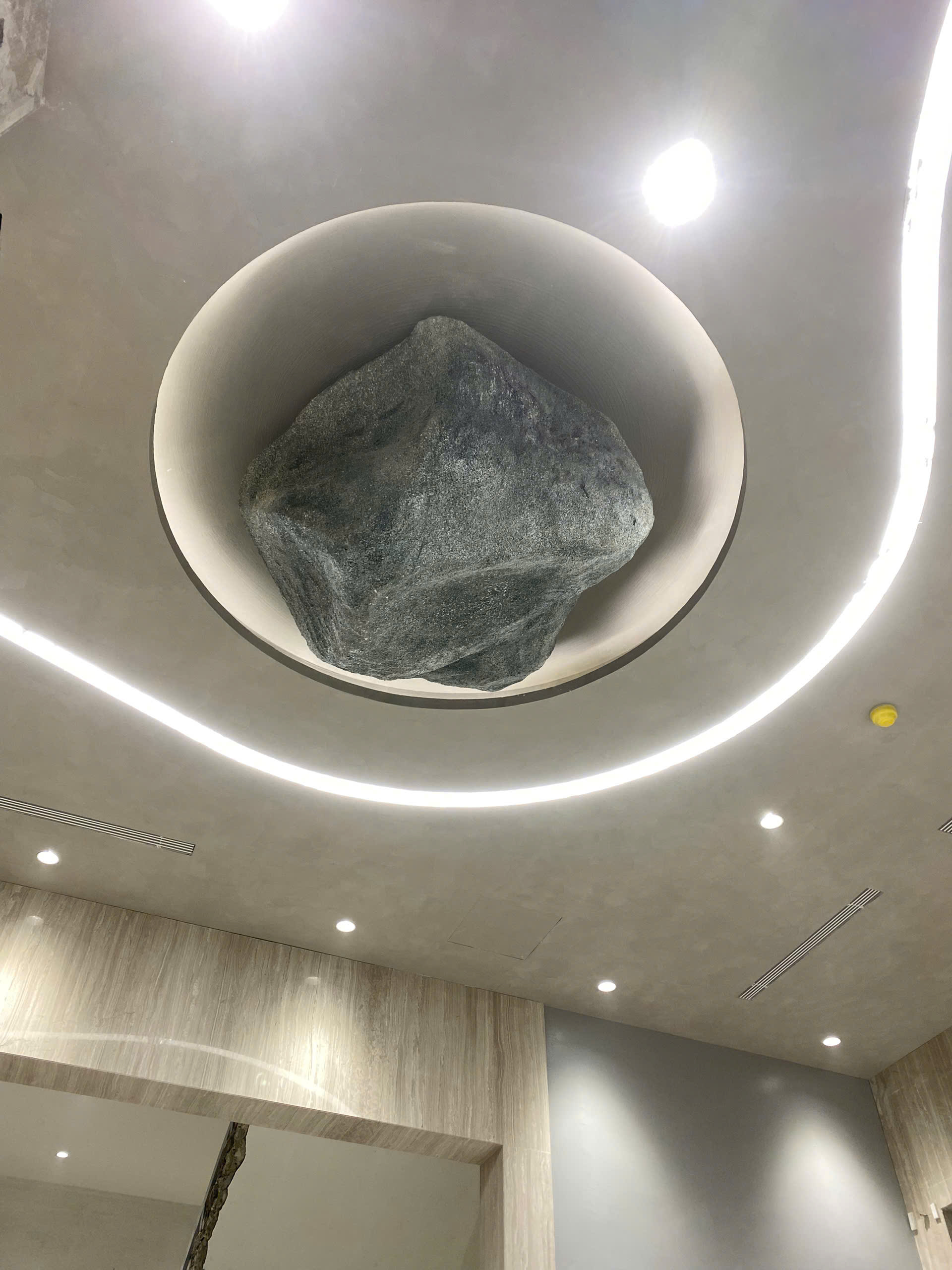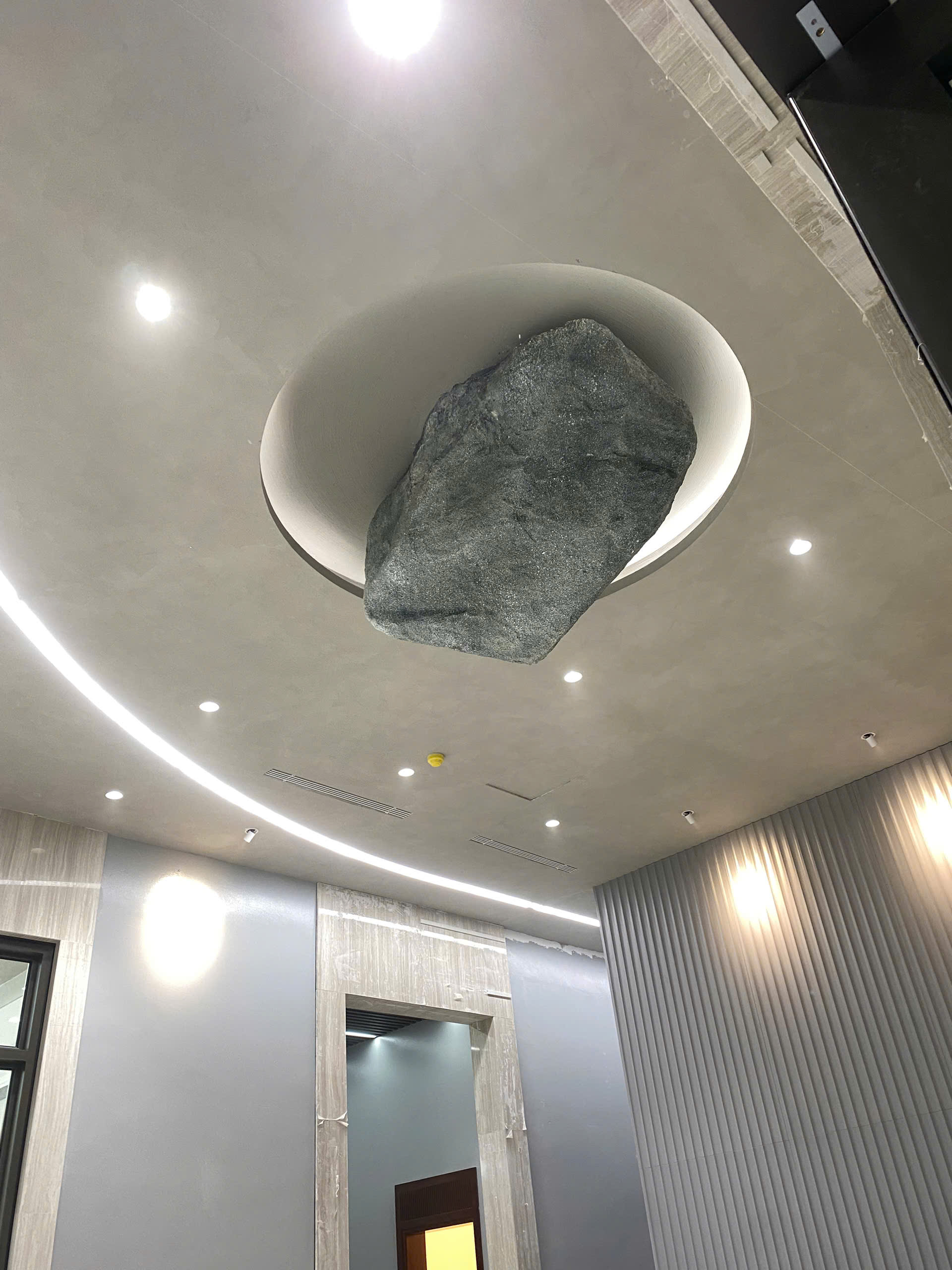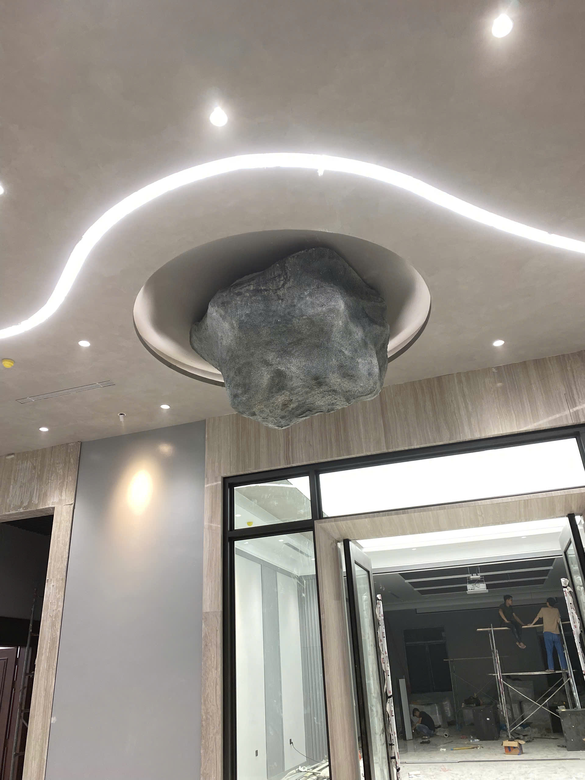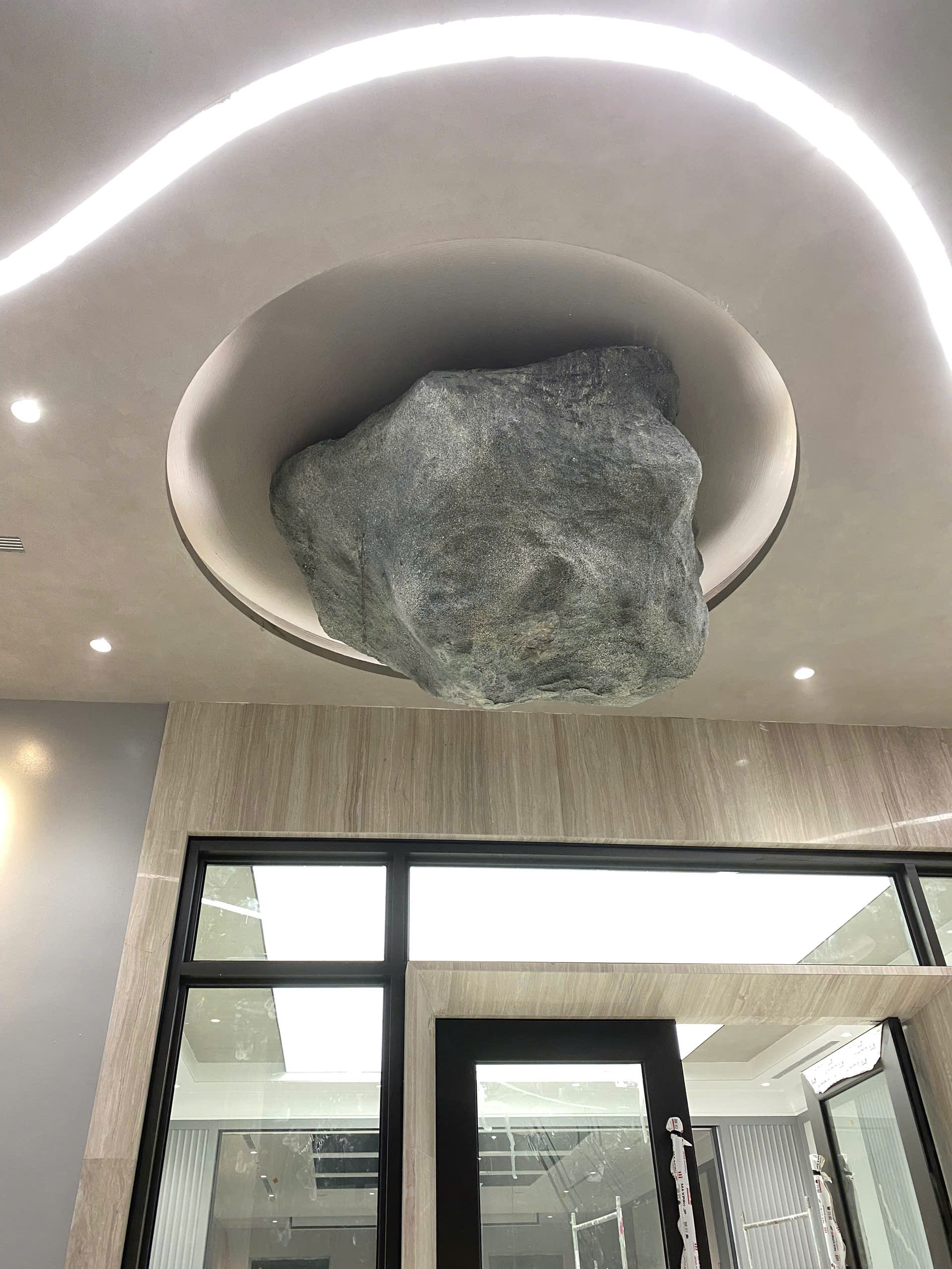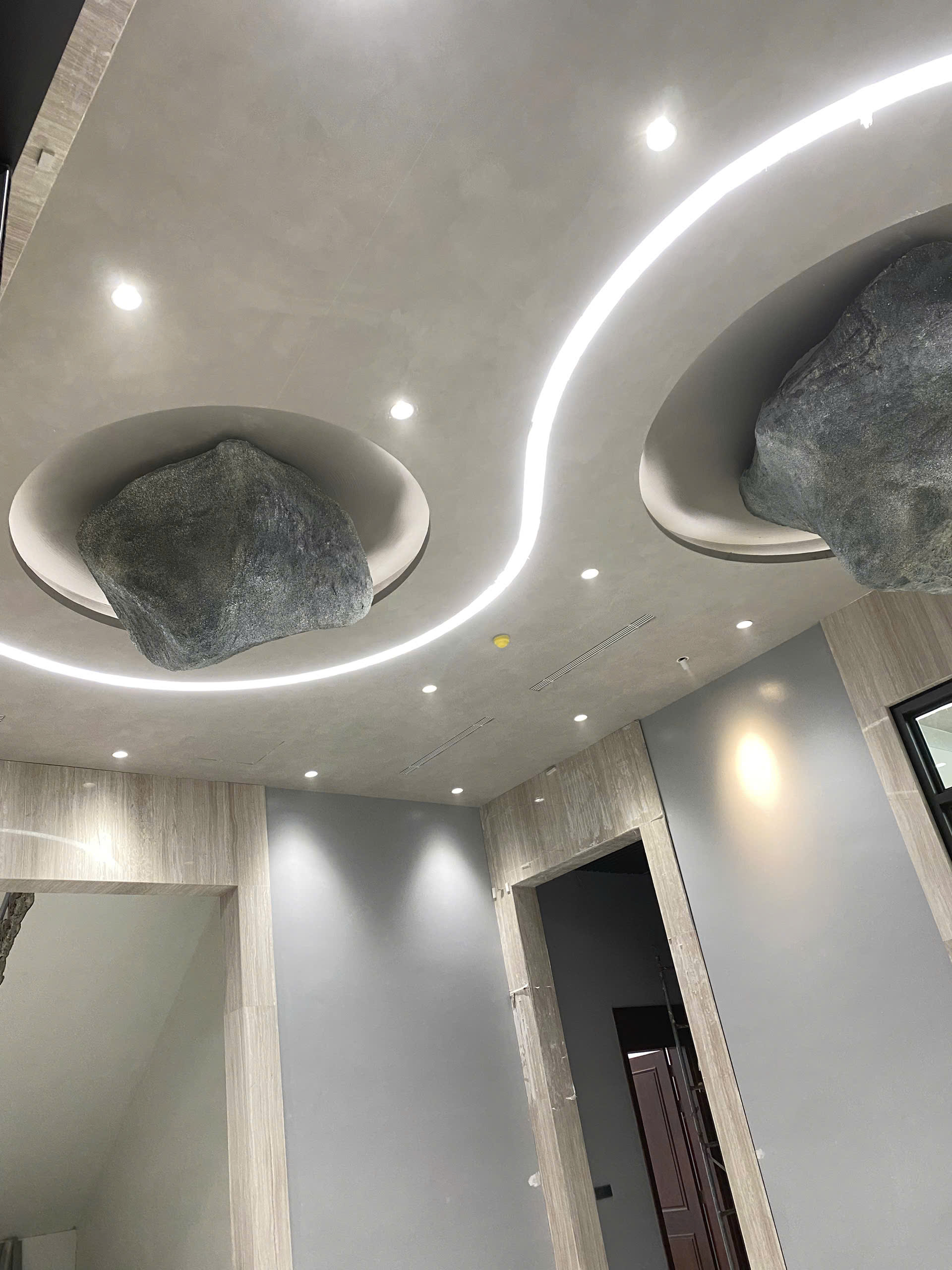 “Đá trên trần” không chỉ gây ấn tượng thị giác, mà còn gợi liên tưởng: sự vững chãi, trường tồn và sức mạnh thiên nhiên được đưa vào không gian sống. Nó tạo ra một điểm nhấn thị giác mạnh, đồng thời thổi vào không gian hơi thở của nghệ thuật đương đại, nơi mà decor không chỉ để làm đẹp, mà để kể chuyện và truyền cảm hứng.