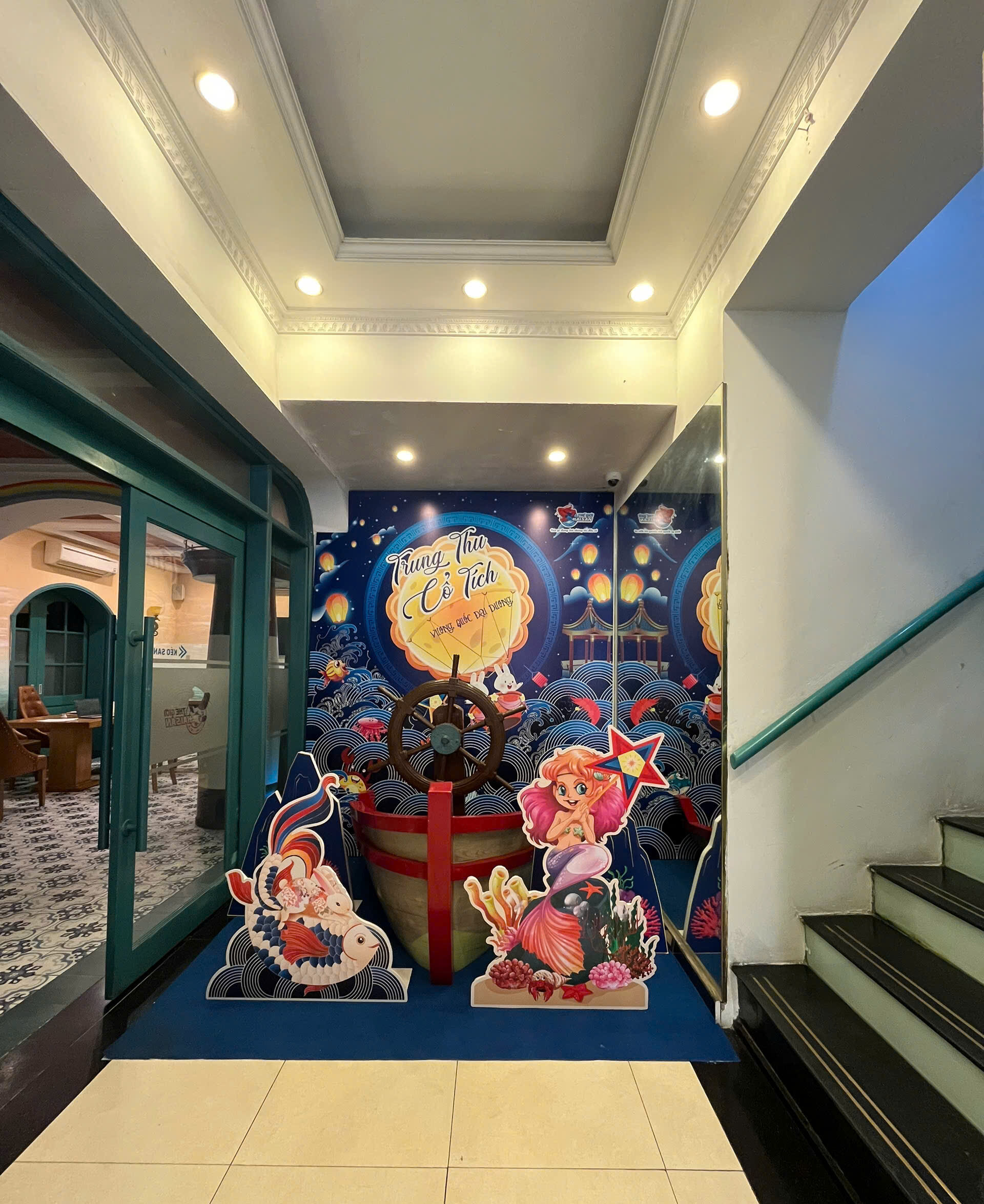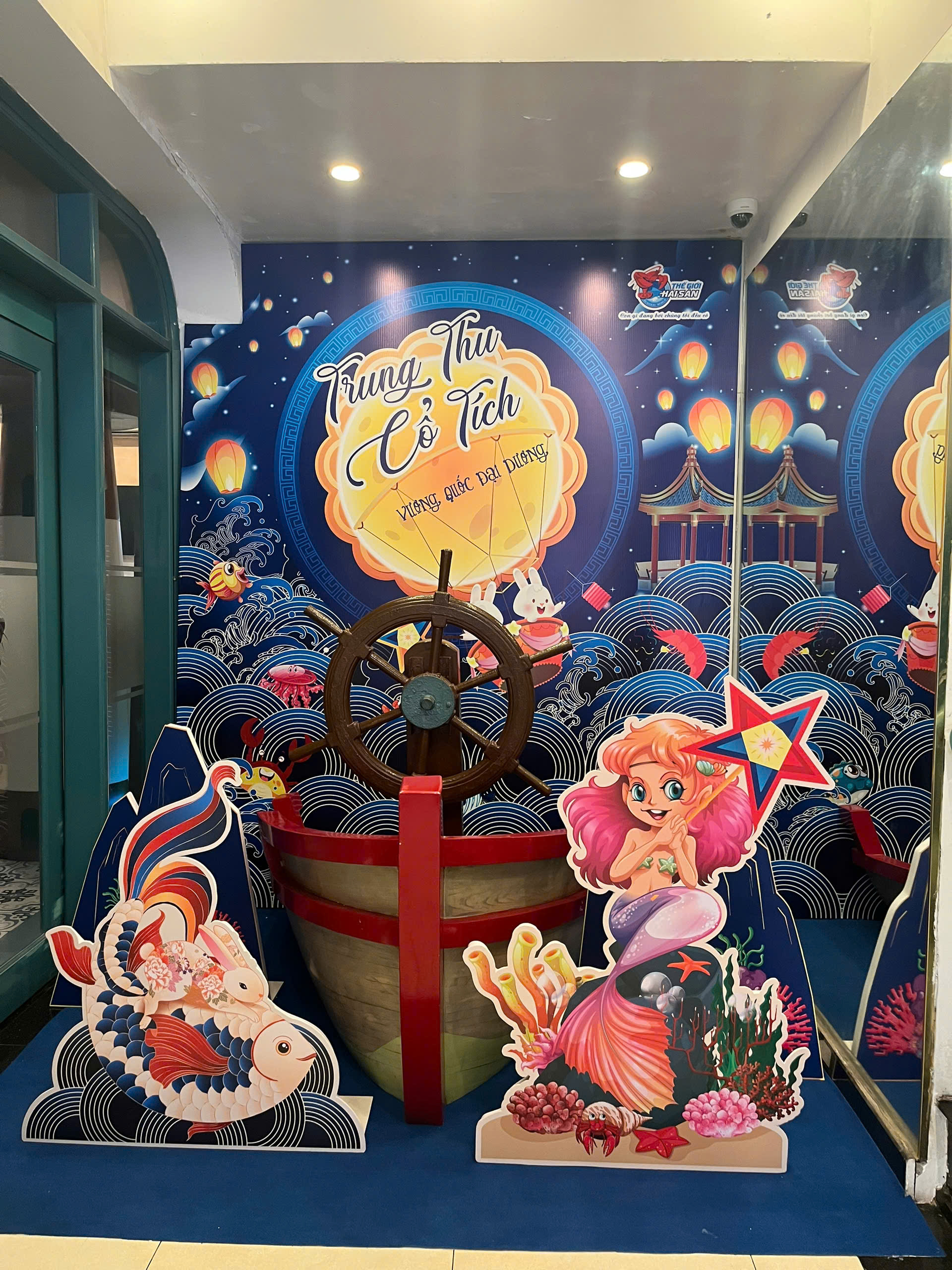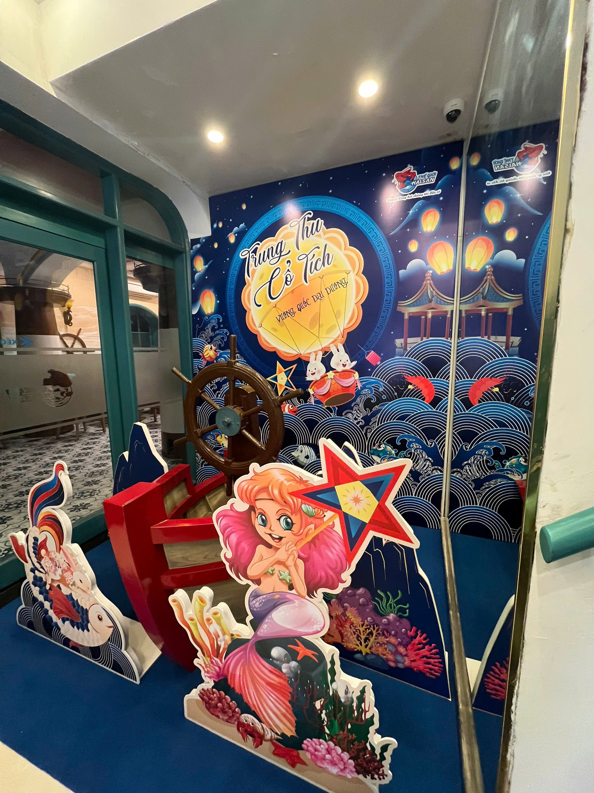 Thay vì chỉ là một góc chụp ảnh, booth Trung thu năm nay được thiết kế như một không gian nghệ thuật kể chuyện, nơi câu chuyện “Nàng tiên cá” được tái hiện qua màu xanh đại dương thương hiệu, xen lẫn những gam đỏ, vàng, cam rực rỡ của mùa lễ hội.